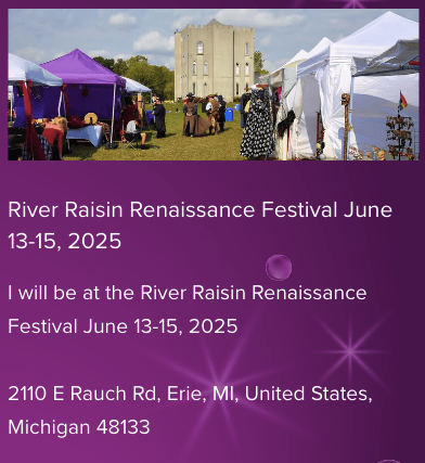 I will be at the River Raisin Renaissance Festival June 13 - 15, 2025.